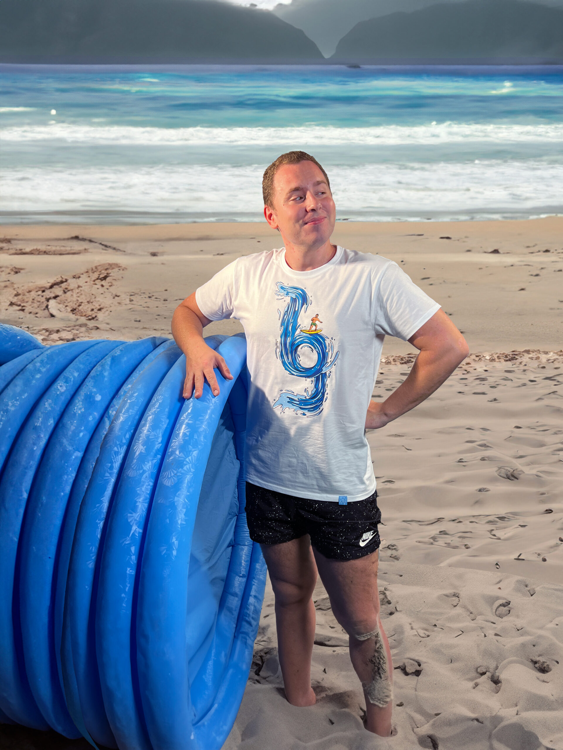 Majica na prsima ima “Braco Gajić logo” u više nijansi plave boje i malog Bracu kako surfuje.